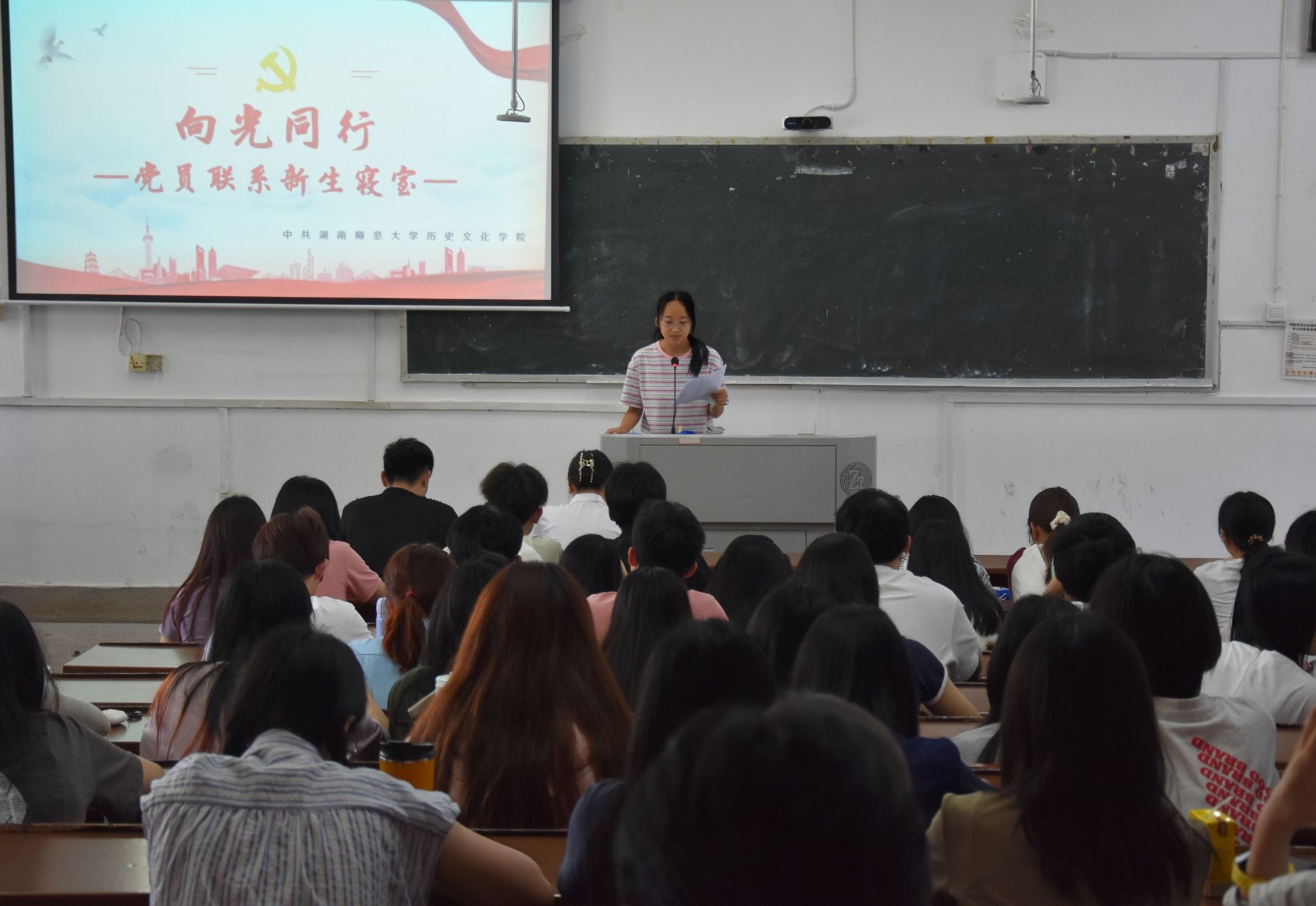 会议伊始,主持人黄梦妮阐释了“向光同行”活动的内涵,回顾了活动启动的初衷:加强基层党建、深化思想引领、服务学生成长。随后,优秀党员代表及其所联系的新生寝室长分别作了交流发言。