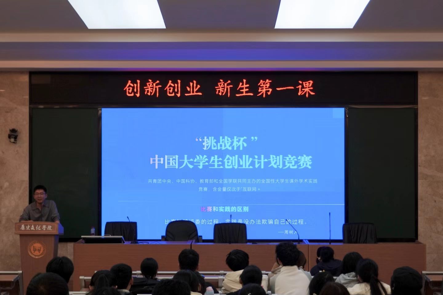 (通讯员 杜玲瑶 龙思贝)11月14日下午,WilliamHill(威廉希尔)官网于文渊楼203学术报告厅召开“创新创业 新生第一课”讲座。创新创业学院校友、黑马日语的创始人胡含兵、创新创业学院何文君和学工办主任陈敏、2025级辅导员胡思琦出席此次会议,部分2024级和2025级学生参加此次会议,讲座由2025级年级长解硕同学主持。