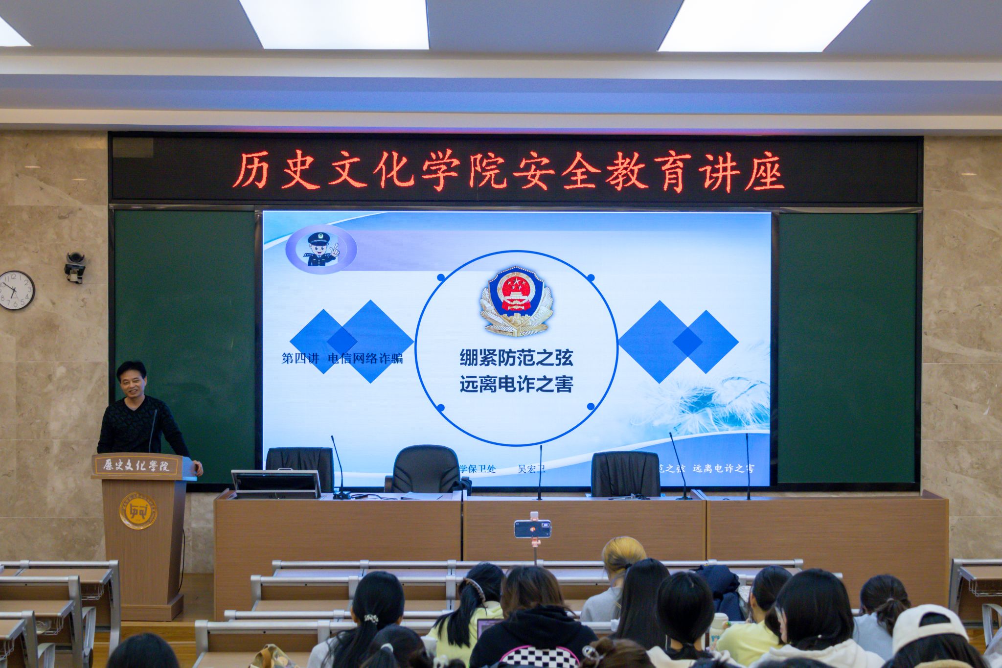此次安全教育讲座分为宿舍安全、电信诈骗、交通安全和女性安全四个部分。吴宏卫通过播放视频向同学们讲解了宿舍安全隐患问题,并举出学校相关事例提醒同学们注意防患火灾和安全用电。针对当前高发的电信网络诈骗,吴宏卫以今年学校电信诈骗的数据说明其严峻形势。他系统地为大家剖析了电信诈骗的含义、常见形式,并给出了实用的防范建议,结合多个案例提醒大家不要贪小便宜、谨防上当。在交通安全部分,吴宏卫强调骑行电动车时要遵守交通规则,规范停车,保障自身与他人的安全。最后他就女性安全提供了建议,提醒女性同学外出尽量结伴而行、穿衣得体、慎重对待情感关系。