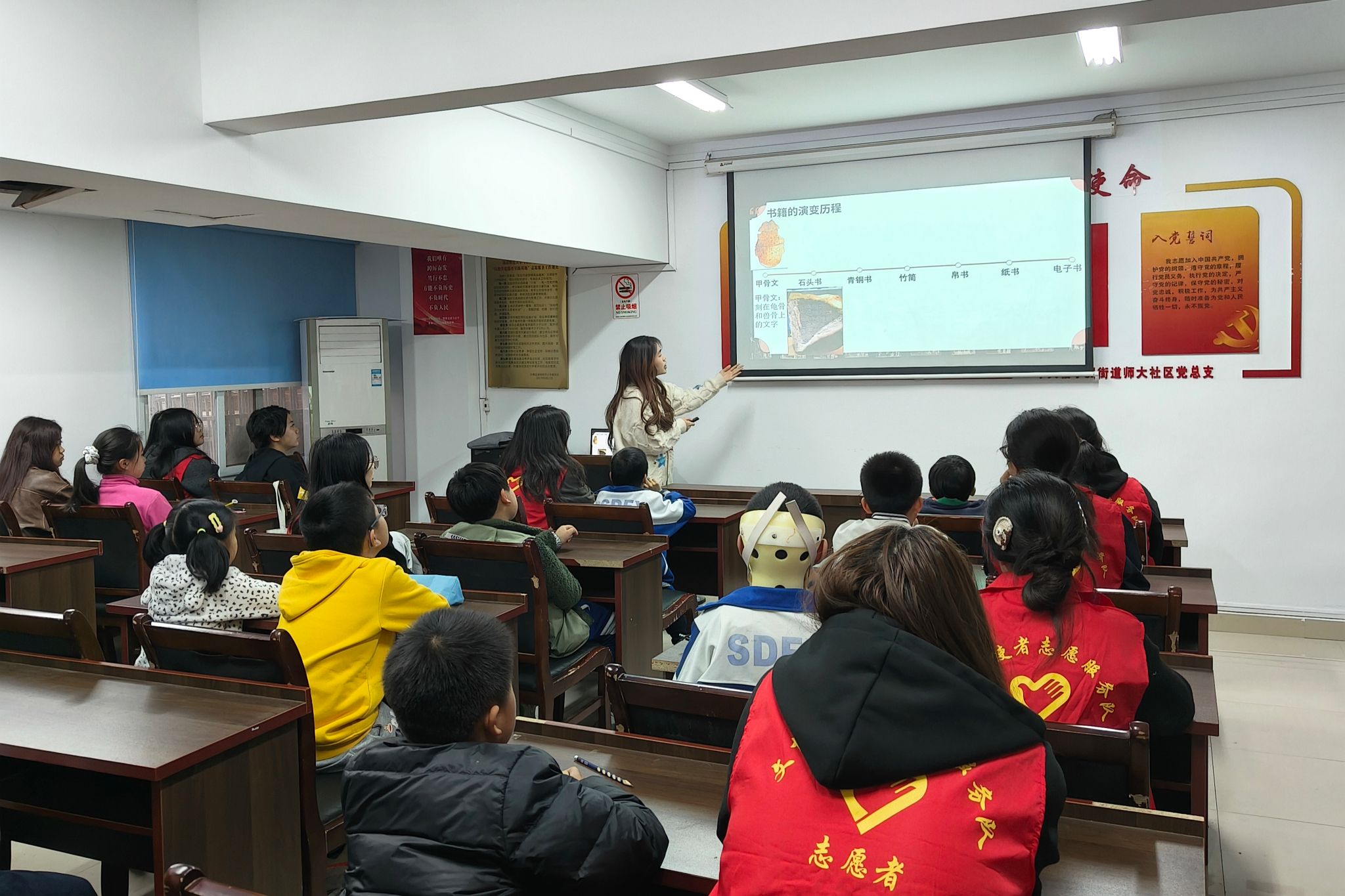 活动开场,志愿者代表以提问的形式调动小朋友们的积极性,引导他们快速融入课堂氛围,随后借助PPT深入浅出地讲解简牍发展历程、制作流程等知识。在互动环节,小朋友们跟随志愿者朗读简牍上的诗词与古代文书,加深对简牍的理解。紧接着,志愿者代表播放与简牍文化相关的视频,并着重介绍湖南出土的里耶秦简和西汉简牍,帮助拓宽小朋友们的视野。