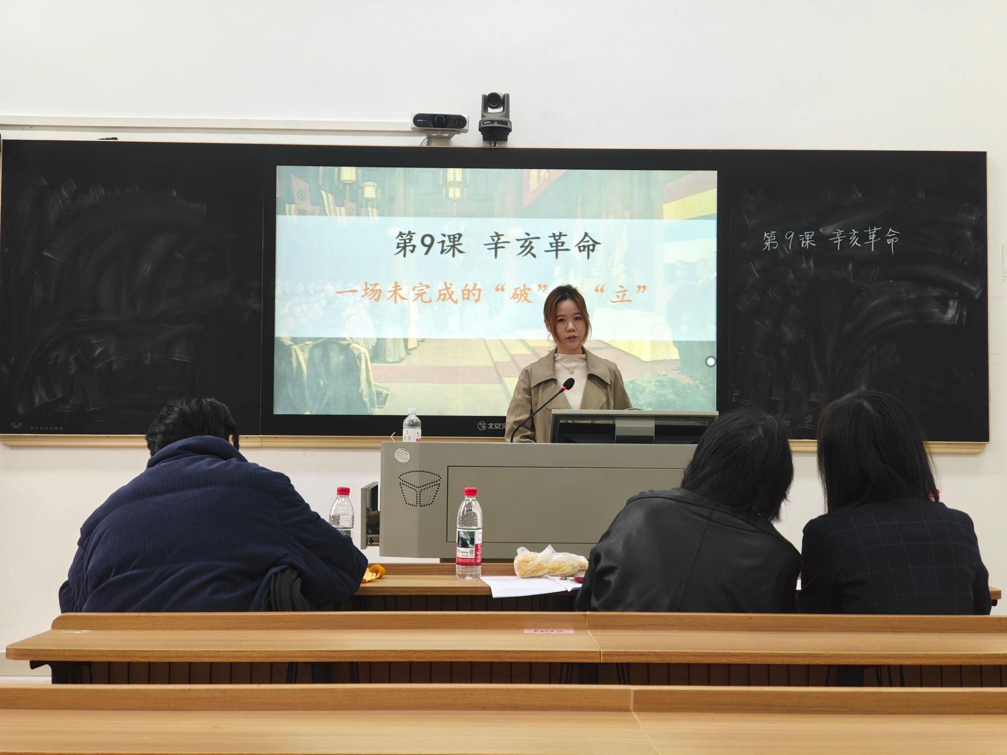 此次比赛采用“8分钟片段教学”形式,比赛成绩分为面试(50%)和笔试(50%)两部分,笔试成绩取“三字一话”、心理学、学校教育学三门课程平均分,面试评分标准涵盖教学设计(30分),多媒体课件制作(20分),片段教学(含板书,50分)三大部分。参赛学生共分为16组,每组由三位评委老师从教学内容设计、课件制作水平、教学语言表达、课堂互动效果等多个维度对学生比赛表现进行综合评判。赛程中,参赛学生需要围绕某特定历史主题展开教学,运用多媒体课件、板书设计等多种教学手段,在规定时间内完成知识点讲授,全面展示教学基本功与课堂驾驭能力。参赛选手全部展示结束后,各赛场评委结合具体表现,从教学逻辑、课堂掌控、教学创新等角度给予针对性反馈。