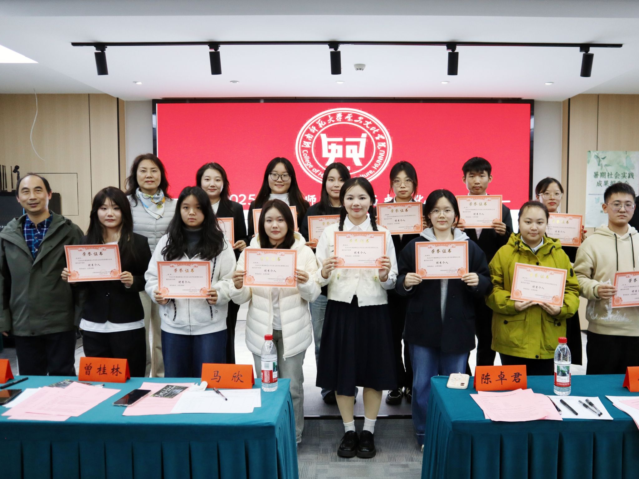各支队伍展示完毕后,评委老师现场对八支队伍进行评分。马欣现场宣读此次评审结果,公布获奖名单并进行颁奖仪式,全体与会老师与获奖团队代表合影留念,此次暑期社会实践成果汇报会落下帷幕。