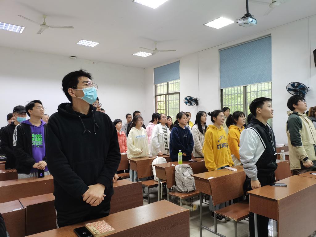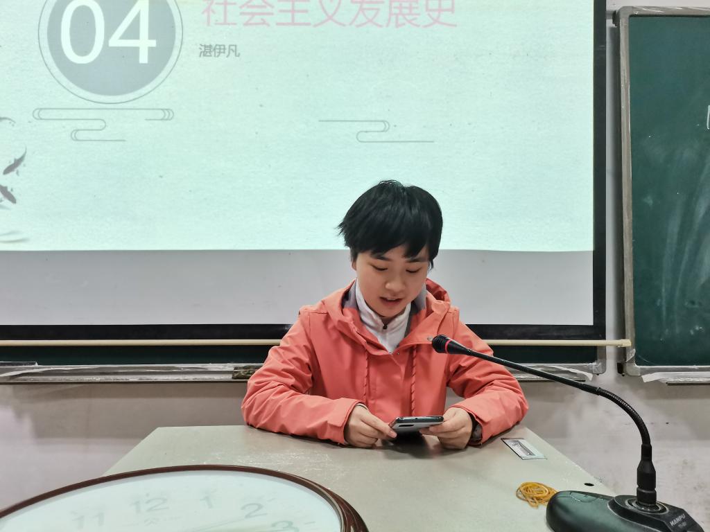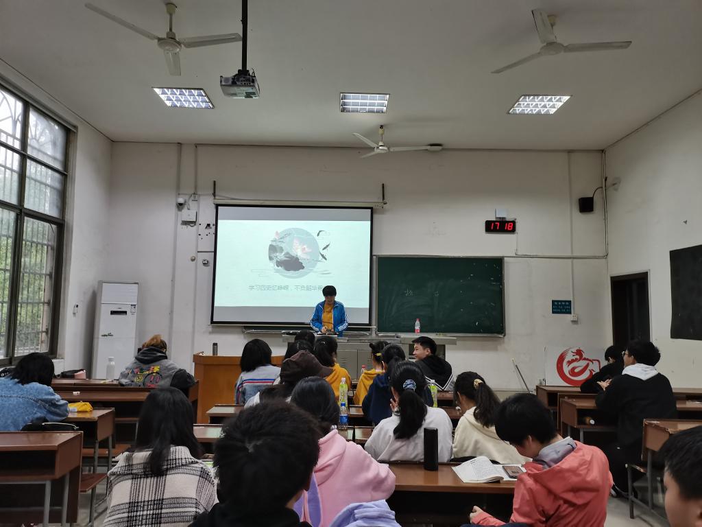 班会开始前,主持人首先对在场人员的到来表示感谢,并简要说明本次班会的流程与目的。随后四位主讲班委分别对党史、新中国史、改革开放史和社会主义发展史做了客观的讲述,向支部成员分享自己的见解和感悟,他们深入浅出的讲解让同学们受益匪浅。最后,军训教官李房做总结发言,他呼吁全体团员抓住机会,赓续奋斗,不忘初心,担起中国青年之责,投身祖国复兴的伟大道路,会议在全体成员热烈的掌声中结束。