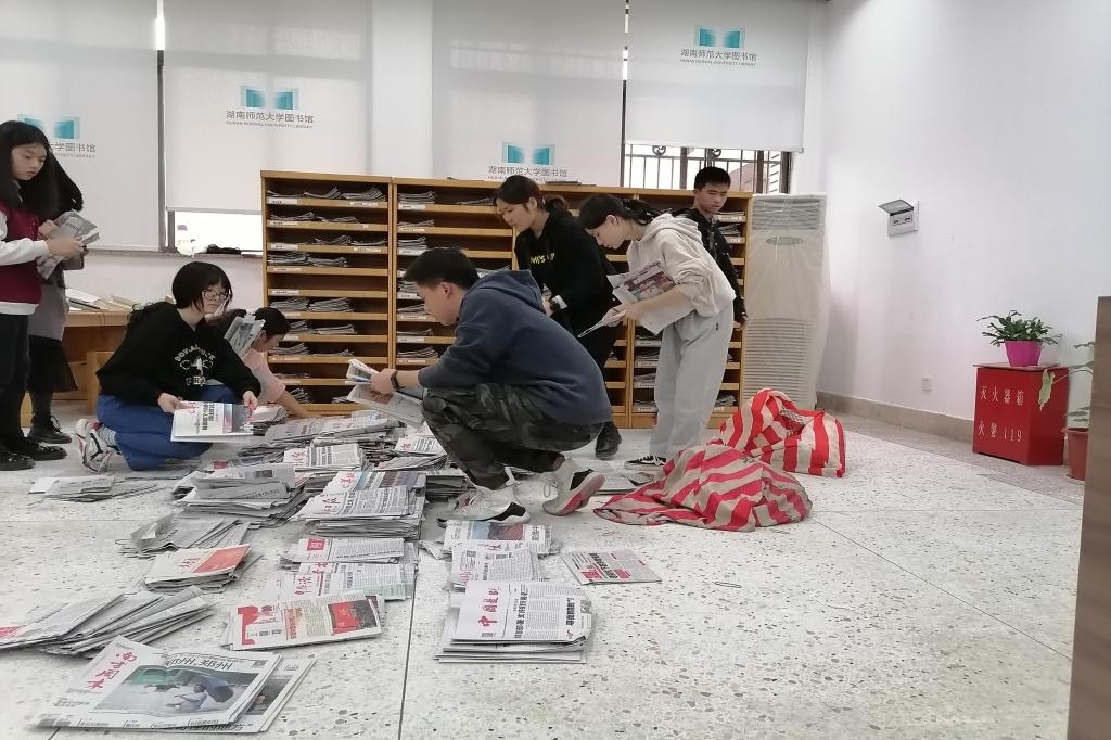 分好任务后,志愿者们分别投入到自己的任务中。一部分志愿者将报纸按照同一种类分好,再将整理好的报纸按照月份扎好,另一部分志愿者则负责将整理好的报纸捆成一摞摆放整齐。活动全程,志愿者们通力合作,齐心协力,高效开展工作,将所有堆积的报纸整理并摆放好。图书馆的负责老师也称赞志愿者们做事认真,超额完成了任务。
