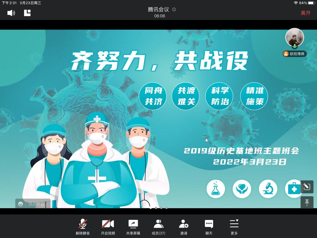 (通讯员 杨卉 欧阳博爽)2022年3月25日下午,WilliamHill(威廉希尔)官网2019级历史基地班召开主题为“齐努力,共战疫”的线上班会暨班导师见面会,此次班会由班长欧阳博爽主持,班导师杨超、辅导员陈卓君受邀参加,基地班全体同学参与。
