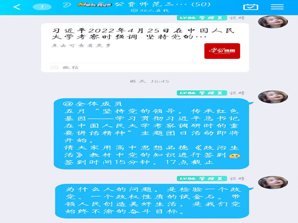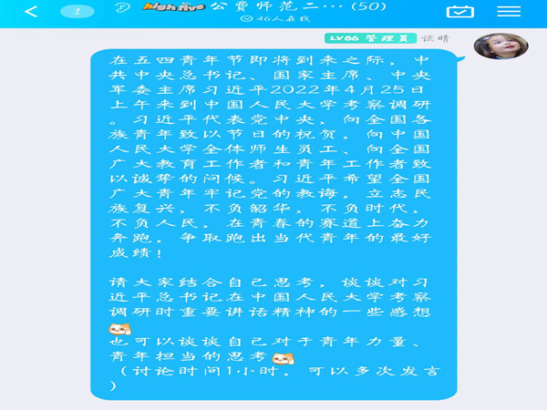 活动开始前,谈晴展示了在五四青年节即将到来之际,中共中央总书记、国家主席、中央军委主席习近平2022年4月25日上午来到中国人民大学考察调研并发表的一系列重要讲话。鼓励同学们通过多种途径提前进行习近平总书记在中国人民大学考察调研时的重要讲话精神学习,并结合主题特色设置签到环节,充分调动起同学们参与活动的积极性。
