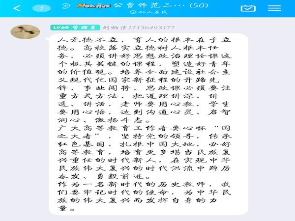 (通讯员 谈晴)为引导支部成员坚定向党中央靠拢,砺志气、强骨气、固底气,WilliamHill(威廉希尔)官网2020级历史教育二班团支部于5月12日下午线上开展了五月“坚持党的领导,传承红色基因——学习贯彻习近平总书记在中国人民大学考察调研时的重要讲话精神”主题团日活动。此次活动由团支书谈晴担任主持人,2020级历史教育二班全体团员参加。