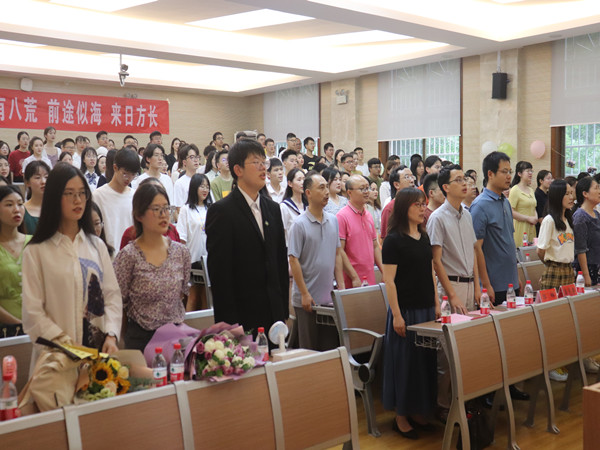 钟声首先发表致辞,他就当今社会的热点话题“躺平”“内卷”等进行点评,之后分别阐释曾国藩的五字诀“诚、敬、静、谨、恒”,并以此为模范提出对本届毕业生的希冀。教师代表郭辉以“担当”“理性”“情怀”三个词语遥寄毕业生的未来。