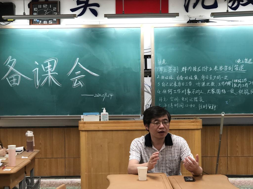 王强山老师首先听取了高一年级第二周的历史教学进度,及各老师的下周教学安排,他以新教材第二课的重难点——诸子学派与百家争鸣为例,指出在高中教学中教师应在学生初中已掌握的基础史实的学情上,更多地把教材知识线索化、条理化,更高层次可以思想化串联。随后,王强山对实习队第一次上台授课的《中外历史纲要(上)》第五课、第六课进行教材解读以及备课思路分析,从确定教材章节,章节子目的重新编排、线索梳理到重、难点的突破这三个方面展开,他强调三国两晋南北朝这一时期的两条线索是非常明晰的:一是政权更迭,二是民族大融合,对于这一分裂割据的时期零碎的知识点和众多的时间节点,教师应该在自身充分熟悉的基础上,通过时间轴等形式帮助学生形成历史时空观。