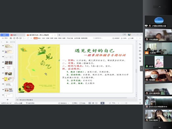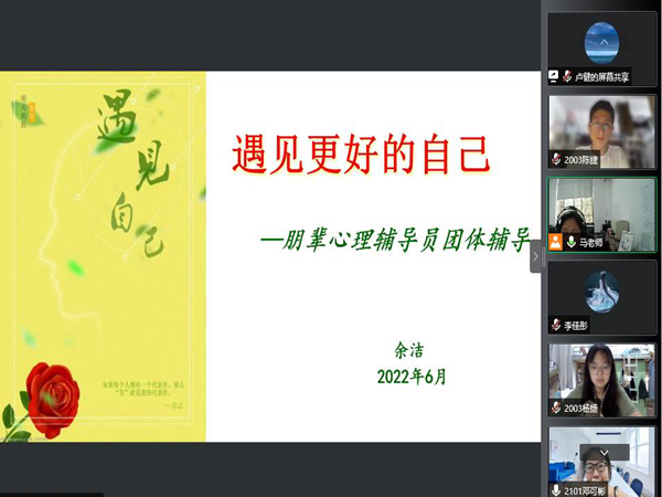 (通讯员 陈捷)2022年6月10日上午,WilliamHill(威廉希尔)官网于线上开展了第三次朋辈心理辅导员培训讲座。此次讲座的主题为“遇见更好的自己——朋辈心理辅导员团体辅导”,由历文院党委副书记马欣主持,校心理健康与咨询中心主任余洁担任主讲人,2019、2020、2021年级全体朋辈心理辅导员及年级辅导员参加。