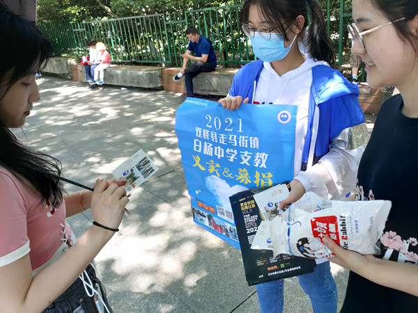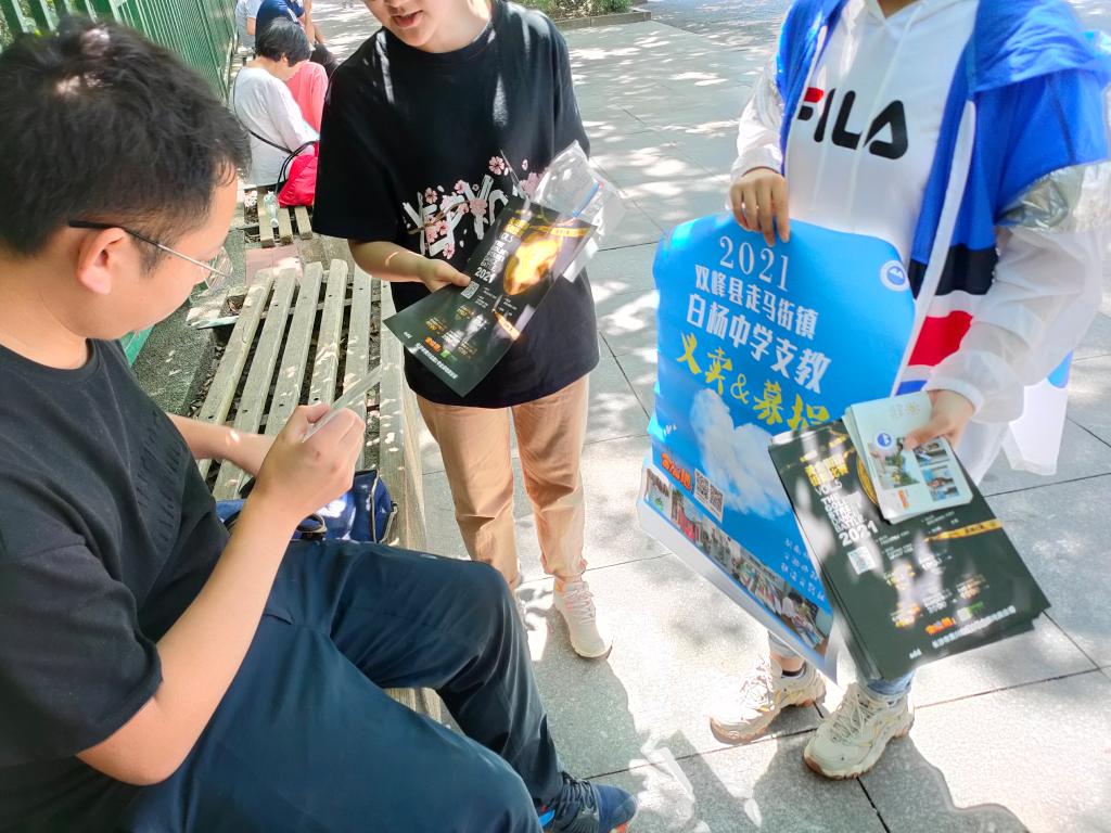 队员们在烈日下向前往岳麓山向游客们介绍并宣传队伍支教活动,在队员坚持不懈的努力下,有热心的游客对活动表示资金支持并且祝愿支教队伍圆满开展活动。队伍对每一个给予帮助的社会各界爱心人士当场深表谢意并赠送一张明信片以表纪念。临近中午时,募捐活动圆满结束,队员们将募捐资金清点整理好并返校。