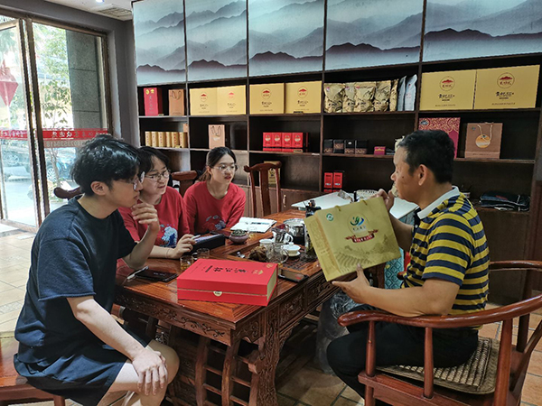 唐社善是东江库区的移民之一,2013年以前从事矿产开发工作。在资兴市进行产业转型时,唐社善所在的矿场关闭停产,在政府的引导下,他转行走上了种植茶叶的新道路。访谈中,唐社善介绍说:资兴市茶叶种植总面积约6万亩,其中东江库区4万多亩,占总面积的70%至80%。他自己的茶园位于资兴市黄草乡滁口镇,他在经营茶园的同时,还带领当地村民组成茶叶生产合作社,经官方认可组建合作社茶叶品牌——东江红茶和贵妃红茶,销往国内外市场。唐先生还向实践团成员介绍道,通过与湖南省茶叶协会和湖南省农科院的合作,东江湖茶叶种植不断吸收新技术、新人才,为茶农增产增收提供了保障。