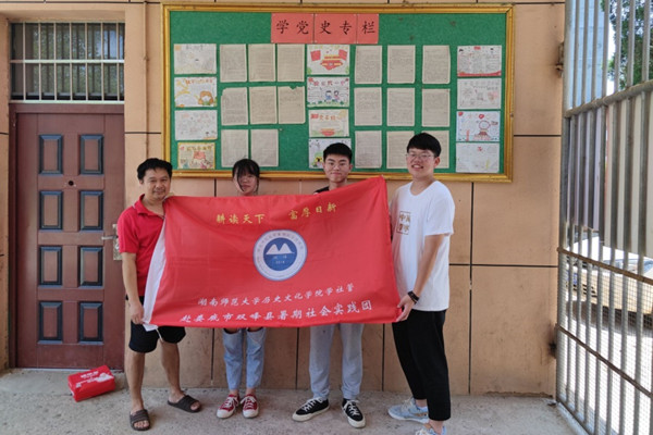 上车前,队员们再次清点了物资,此次的物资有湖师大同学们捐献的书籍、金满地商业街提供的礼品等等。白杨中学的校长朱如峰接待了队员们,随之还亲切慰问了几位同学并准备了水和饮品。朱如峰表示,很感谢几位队员们能够为乡镇学生们送来温暖,相信白杨中学的同学们会很喜欢的。随后,朱如峰带实践队的队员们参观了学校,介绍了白杨中学现在发展的情况:湖南省双峰县白杨中学创建于1969年,校园占地40亩,建筑面积4500平方米。服务走马街镇白杨总支所辖10个行政村12000余人,现有学生421人,教职工28人。最后,实践队成员与校长朱如峰,以及其他校领导一起合影留念。