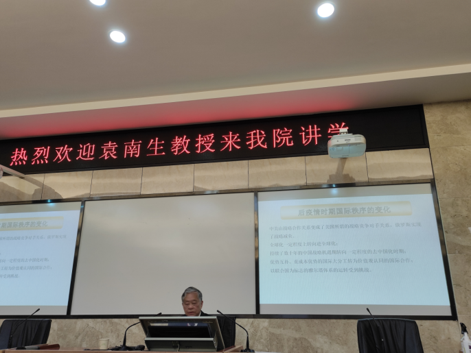 袁南生教授以深厚的学识、风趣的语言、生动的事例对后疫情时期的国际秩序和中国的影响力进行了分析讲解。提问环节,在场师生热切与袁教授交流自身观点与困惑,获益良多。