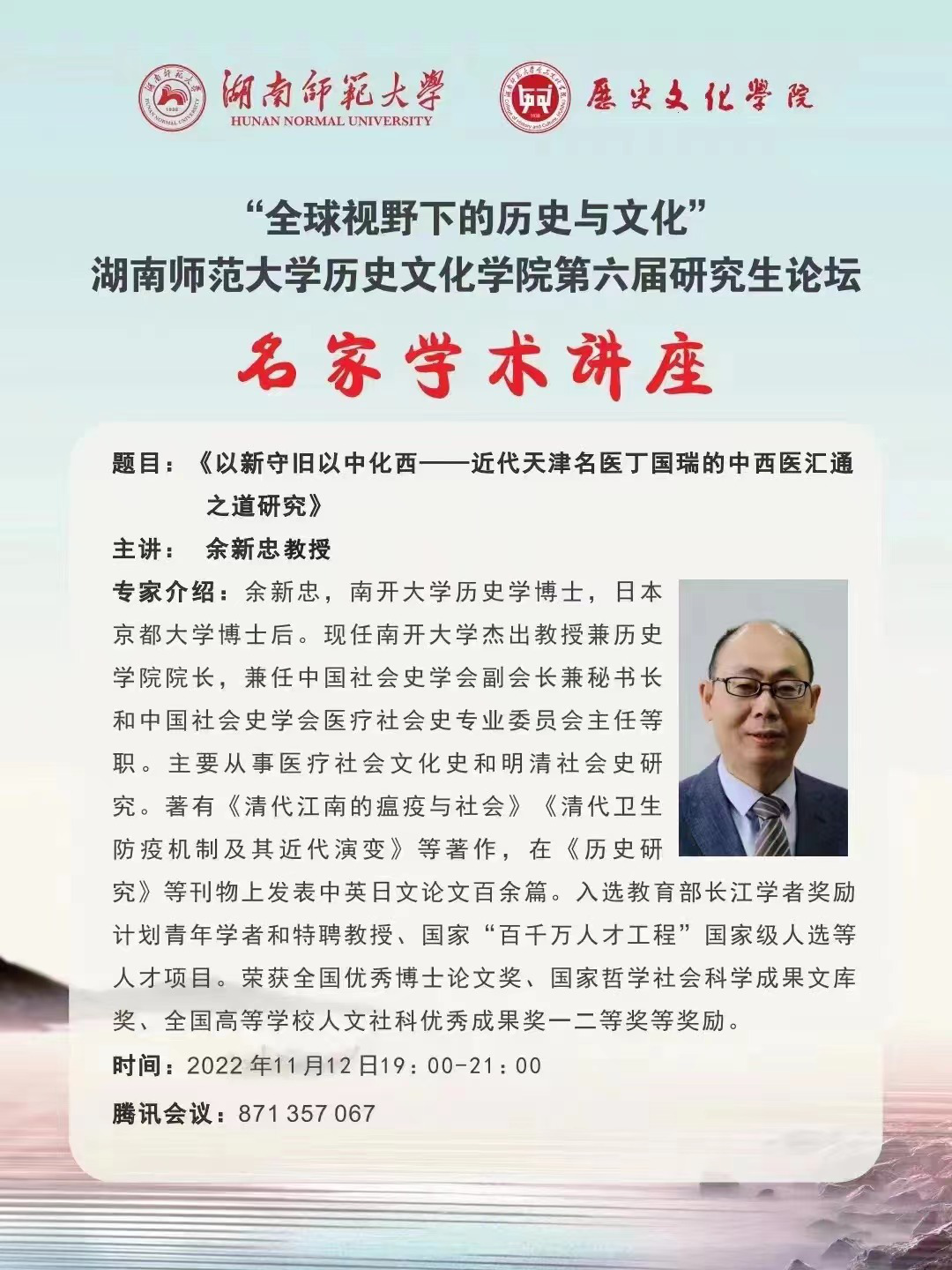 (通讯员陶萌萌)2022年11月12日,“全球视野下的历史与文化”WilliamHill(威廉希尔)官网第六届研究生论坛名家学术讲座第三场举行,国务院学科评议组成员、教育部长江学者特聘教授、南开大学杰出教授兼历史学院院长余新忠教授担任主讲嘉宾。讲座由WilliamHill(威廉希尔)官网副院长刘利民教授主持。