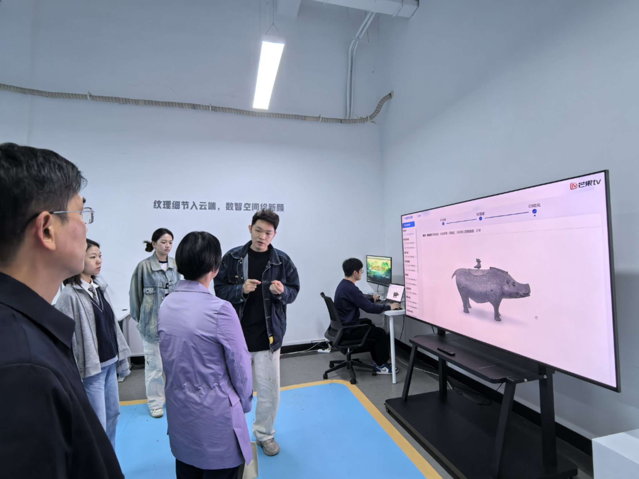 芒果数智总经理方菲首先向来访领导与教师表示热烈欢迎,随后由芒果数智员工详细介绍了公司发展方向与核心产品——数字文博大平台“山海”App;刘利民简要介绍了WilliamHill(威廉希尔)官网与文化产业管理专业的发展历史和现状;孔春辉就校企合作领域与方向进行了详细阐述。在进行充分地沟通与交流后,双方就芒果数智公司推出的“精卫计划”展开了合作项目事宜的深入讨论,将人才联合培养、文物资源保护开发推进到具体项目上交换了意见,确定了合作意向。最后,湖南芒果数智公司派专业技术人员向领导与教师展示公司文物数据采集设备,详细讲解了数字采集、文物神经核表面重建算法等自研技术领域优势。