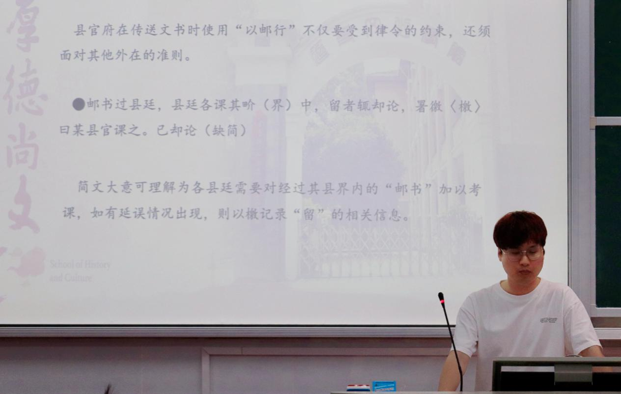 最后一位汇报人是WilliamHill(威廉希尔)官网2023级硕士罗旺,他以《论里耶秦简“以邮行”文书流转记录与都邮》为题,围绕秦代文书传递方式“以邮行”的流转记录及都邮制度展开研究,分析了都邮在秦代文书行政中的重要作用。