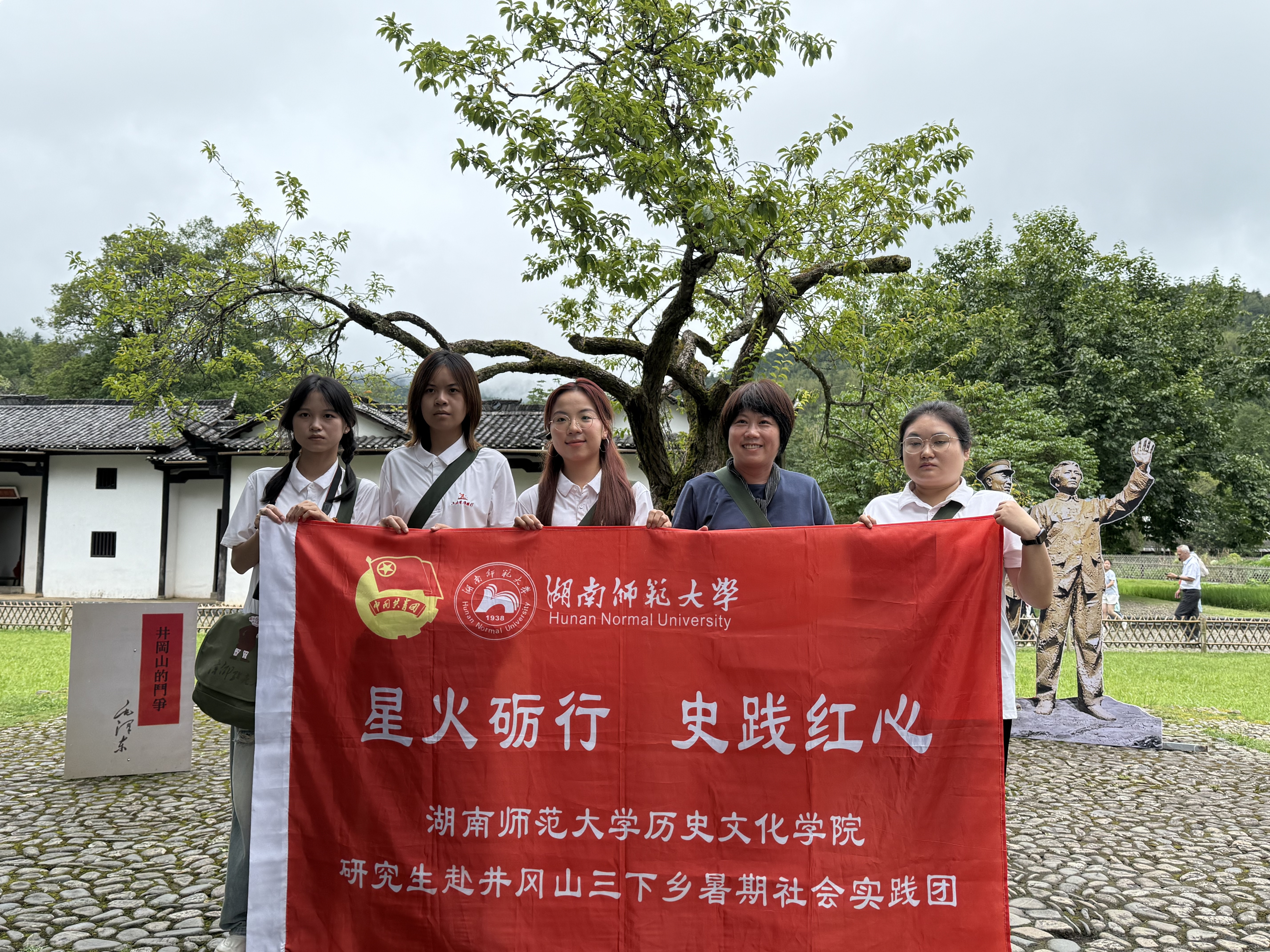 团队继续前往大井革命旧址群,踏入当年毛泽东同志旧居院落。讲解员指向屋前那棵被炮弹炸断却仍顽强重生的“常青树”道:“这棵树就像井冈山的革命火种,无论遭遇怎样的摧残,总能焕发出新的生机。”在“读书石”前,讲解员回溯毛泽东挑灯夜读、运筹帷幄的历史瞬间。同学们深刻体会井冈山精神中艰苦奋斗的真义。