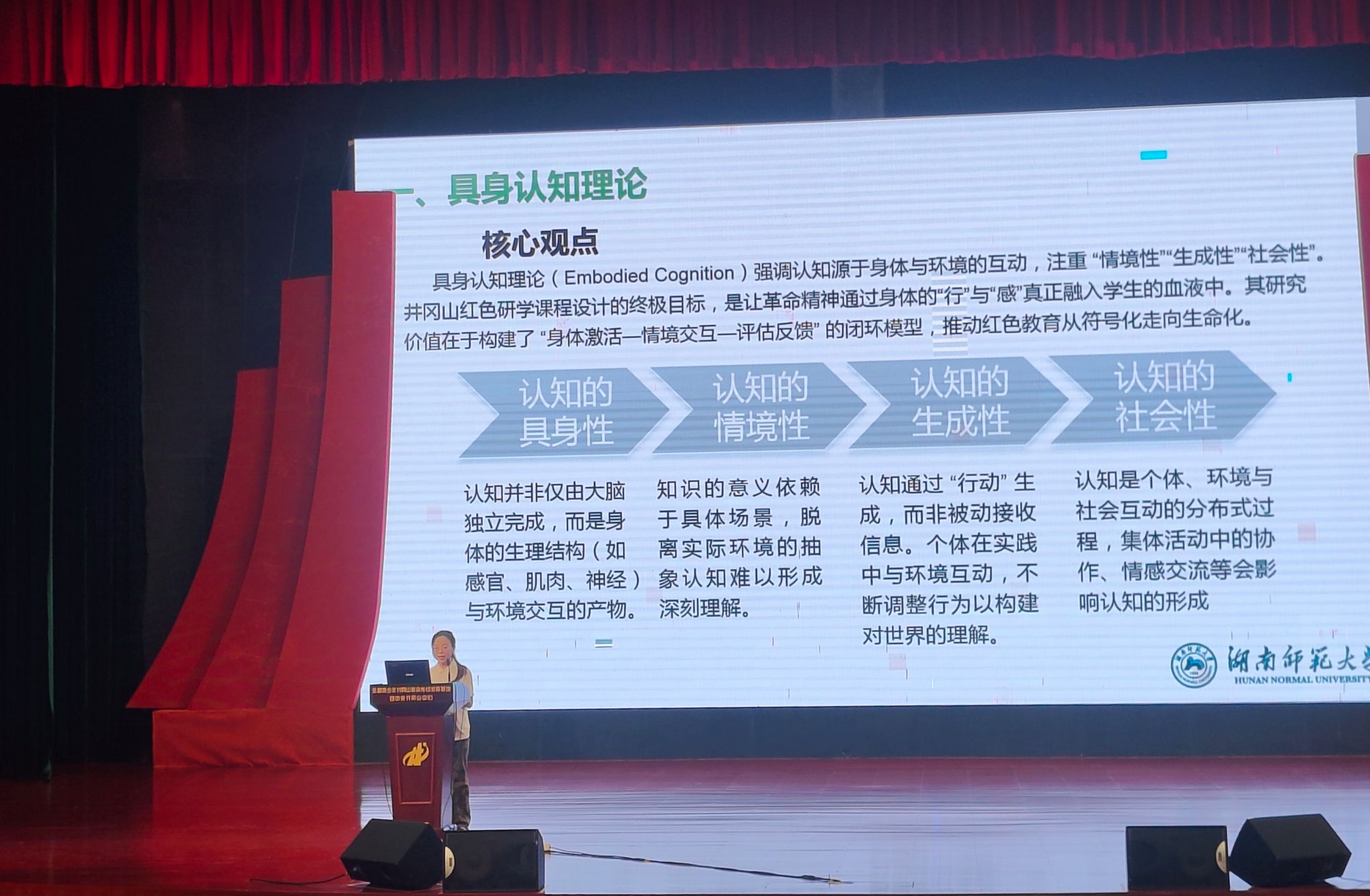 在调研成果汇报会上,实践团成员黄钰桂以“具身认知理论为指导,聚焦井冈山红色教育模式的实效性研究”为题对此次实践成果进行了汇报。通过对实践的系统分析,团队总结出“三化四线”教育模式:“三化”即红色文化资源向教学资源、教学资源向课程资源、课程资源向学员素养的转化;“四线”包括政府支持的支撑线、课堂教学的信仰线、管理机制的赋能线、实践推进的主力线,多维度保障红色教育从“形式开展”转向“实效落地”。实践团成员为深入了解井冈山红色教育模式满意度,结合具体认知理论,通过问卷调查的方式对本次参与井冈山红色研学的同学进行了调研。结果显示,超85%的受访者认为本次井冈山研学活动在实践设计、场景沉浸等方面成效显著;80%的受访者表示,通过此次研学实践,更加深刻理解了井冈山精神。