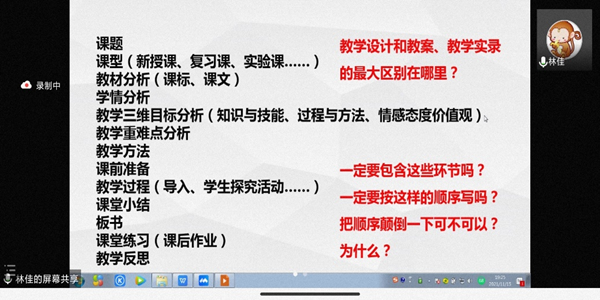 林佳首先由教学设计的概念与流程展开论题,通过对听众的提问与追问,强调教学设计的每个环节均应具备内在逻辑,各个环节不可或缺、不可颠倒。随后,林佳进一步以“2021年宝安区初中青年教师教学能力大赛”的试题和答卷为例,从部编版七年级《远古的传说》一课入手为同学们详细分析了一线教学设计实例中的常见问题,强调教师在进行教学设计时要始终以学生为主体,并且采用多样的教学方法、进行板书的设计等。