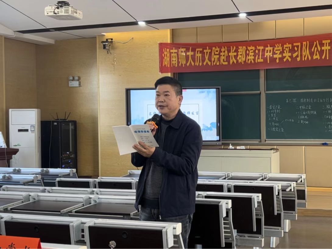 公开课展示完毕后,许富生和向常水老师肯定了两位同学的授课,指出了两位老师在课程准备、设计、展示方面的优点,对比二者之间的风格差异,给出了具有针对性的建议。院长黎天宇对此次实习中的各方表示了真挚的感谢和诚心诚意的祝福,并期待与长郡滨江中学友谊长存,今后多加合作。