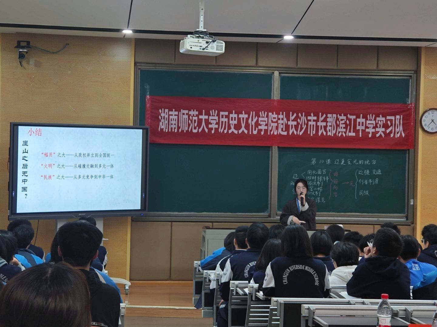 在公开课汇报环节,实习生吴星星代表全队进行《第10课 辽夏金元的统治》的课堂教学展示。她以“何为‘小中国’、何以成‘大中国’”为主线,运用广胜寺元代壁画切入主题,带领学生探讨辽、夏、金、元的制度建设与民族融合,揭示“因俗而治”的历史智慧与多元一体格局的形成。在授课过程中,她巧妙融入AI技术,充分展现了技术融合教学的多元路径。通过时间轴梳理、史料研读与情境创设,层层引导学生思考,课堂逻辑清晰、互动充分。这堂生动而深刻的公开课汇报,凝练了队员们两个月以来的教学积累与飞速成长,充分展示了他们扎实的专业素养和出色的课堂驾驭能力。