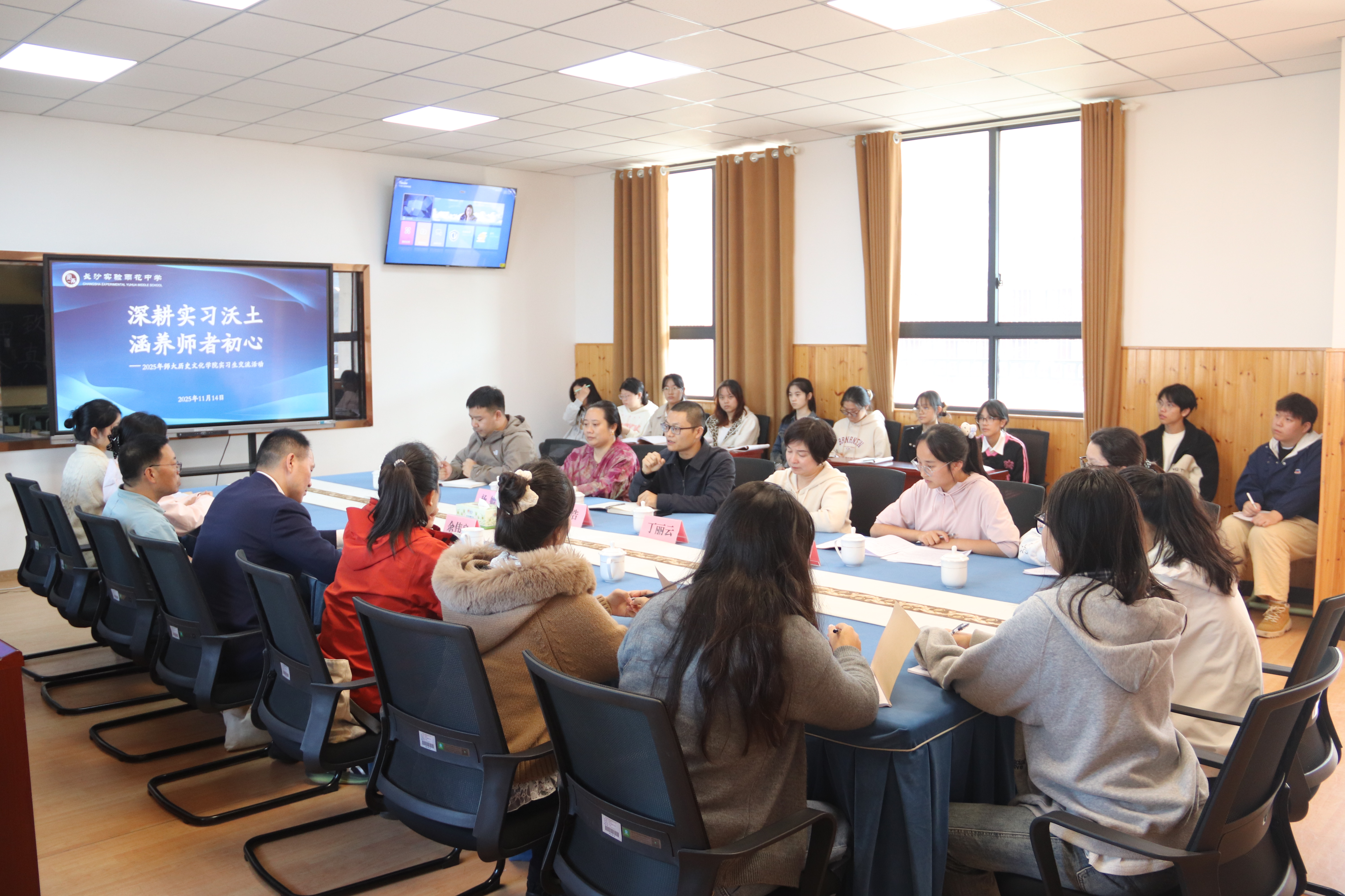 本次座谈会在长沙实验雨花中学善思楼会议室举行。长沙实验雨花中学党总支书记罗浩,副校长丁丽云、杨嫱,教务处主任黎栋,实习队指导老师向常水及实习队全体同学参加了此次座谈。