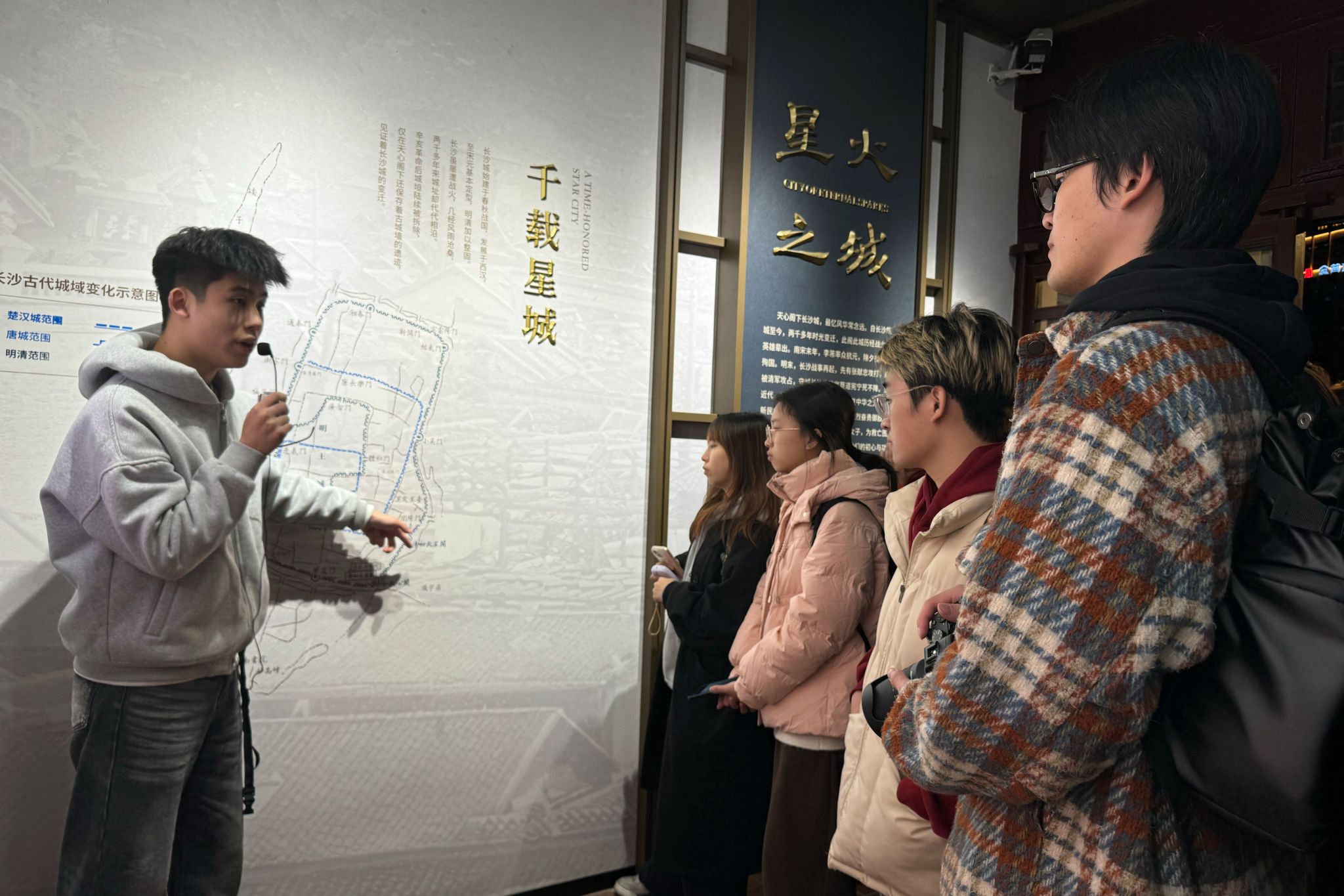 考察当晚,师生们在讲解员的带领下踏入天心阁景区,循着历史脉络探寻文化根脉。参观过程中,讲解员详细介绍了古建筑的历史沿革、文物价值及保护现状。同学们通过近距离观察AI讲解设备、光影景观等文旅融合设施,直观感受到了文化遗产的现代活化路径。活动结束之际,星阁文旅吴颖姝强调,景区应坚持“保护性开发”原则,通过科技赋能等方式让历史“活起来”,同时提出了文化遗产活态传承与市场化运营的探索课题。