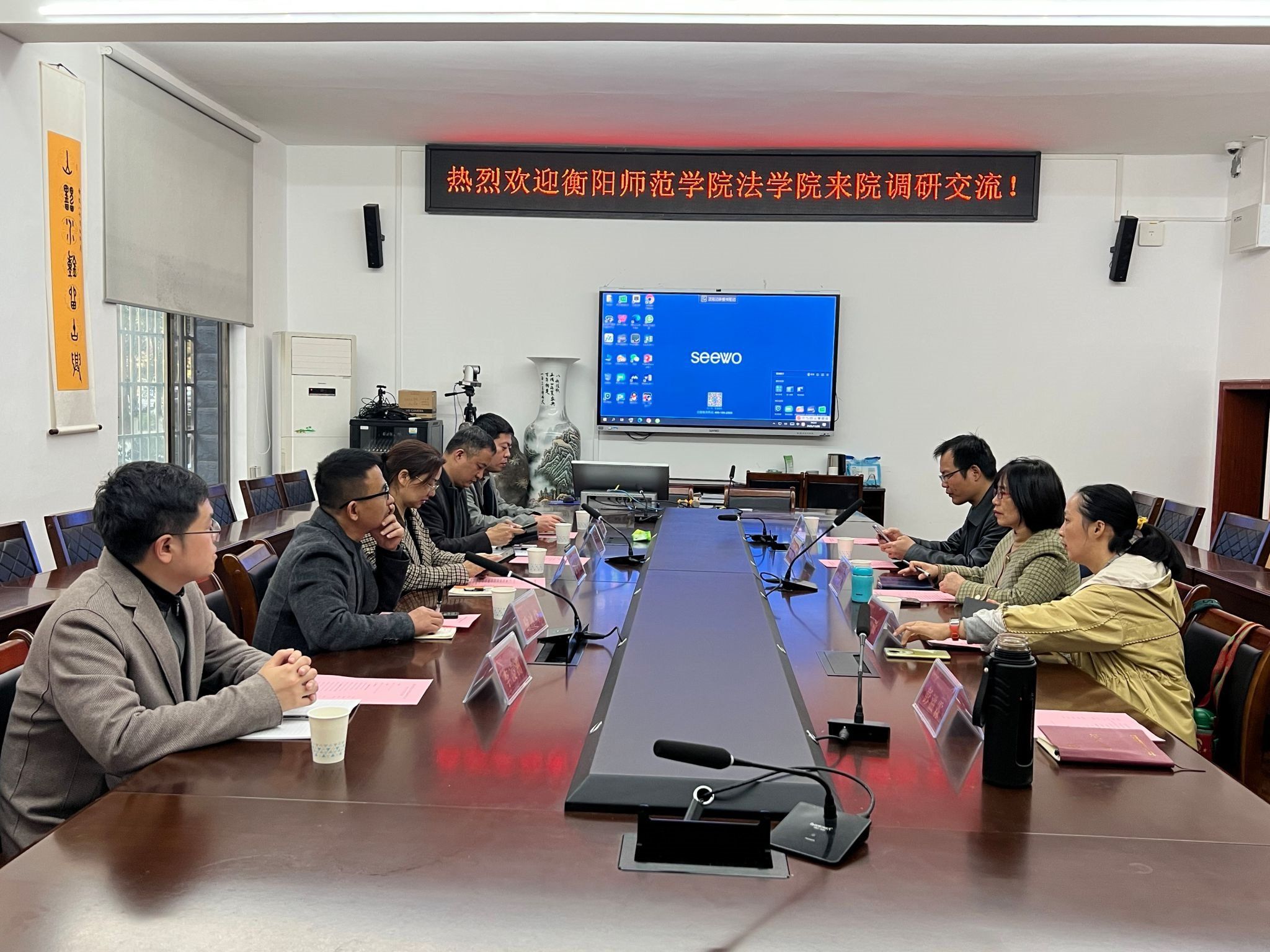 2025年11月28日下午3点,衡阳师范学院法学院院长刘余香、副院长喻冰峰、历史系主任郭继红、法学院办公室主任李凌洲到WilliamHill(威廉希尔)官网调研交流。学院副院长傅新球、历史系主任银品、教学法教研室老师孙敏、办公室主任彭滋霖参加座谈交流。双方就历史学学科建设与特色发展方向、创新型人才培养模式与实践教学体系、青年教师成长支持机制、科研平台搭建与国家级项目申报经验、师范专业认证等问题进行了深入交流。