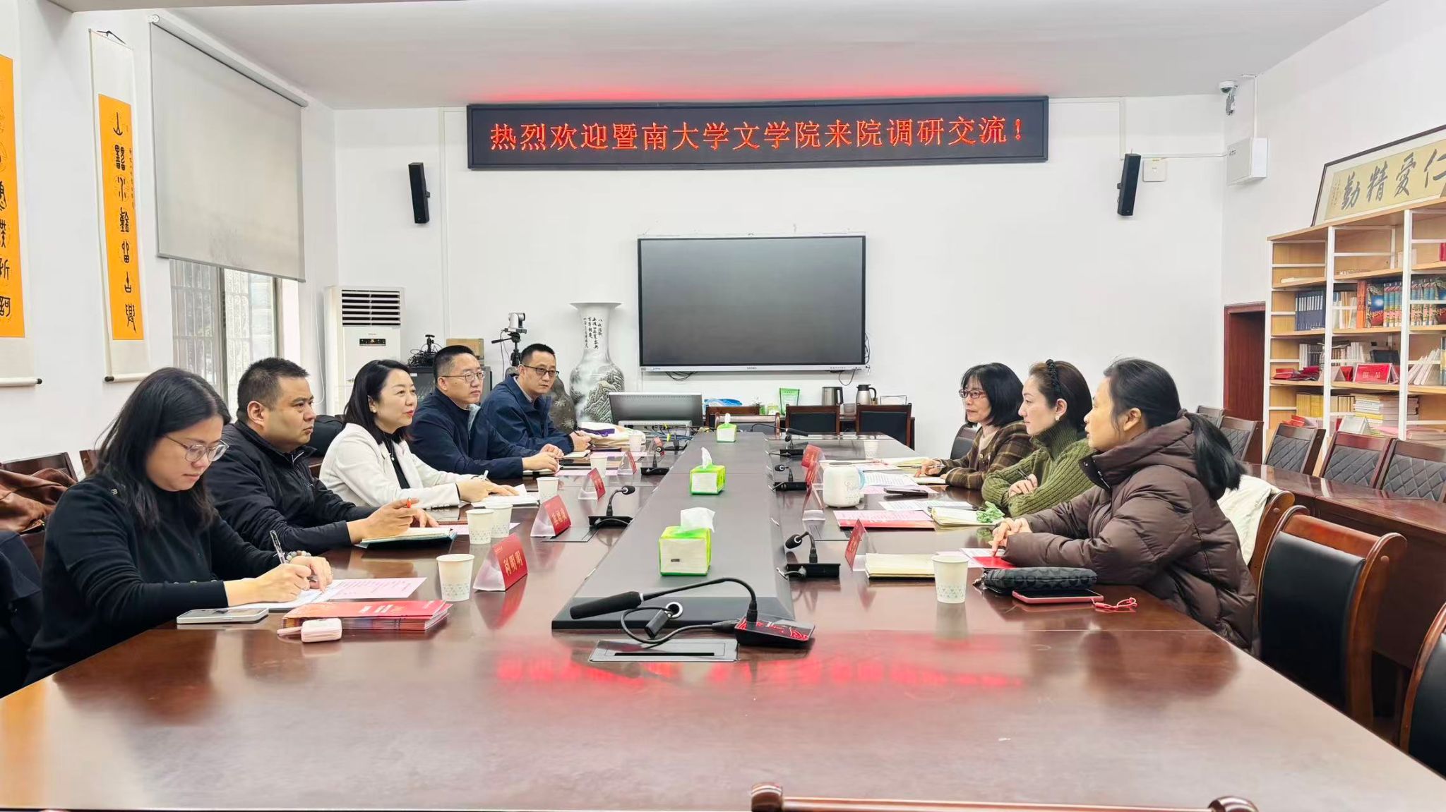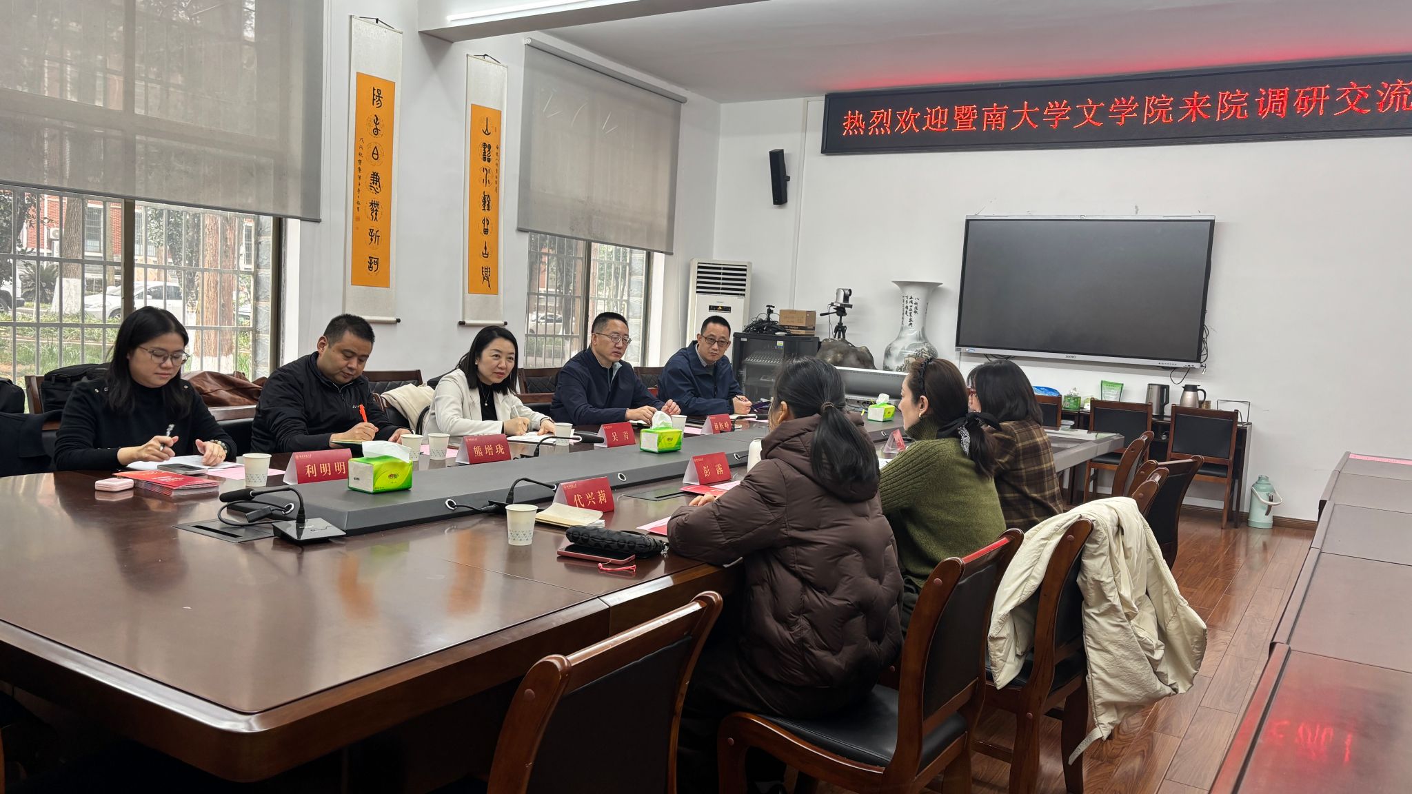 2025年12月22日下午3点,暨南大学文学院副院长吴青、历史系副主任熊增珑、中文系副主任温明明、教学科研办公室主任赫栋峰、教科办秘书利明明到WilliamHill(威廉希尔)官网调研交流。学院副书记(主持党委日常工作)彭露、副院长傅新球、科研办公室主任兰岚、教务办主任代兴莉参加座谈交流。双方就历史学(师范)本科人才培训方案修订、历史学(师范)专业实习、历史学(师范)专业人工智能时代背景下传统文科专业改造升级的举措、博士后招聘等问题进行了深入交流。