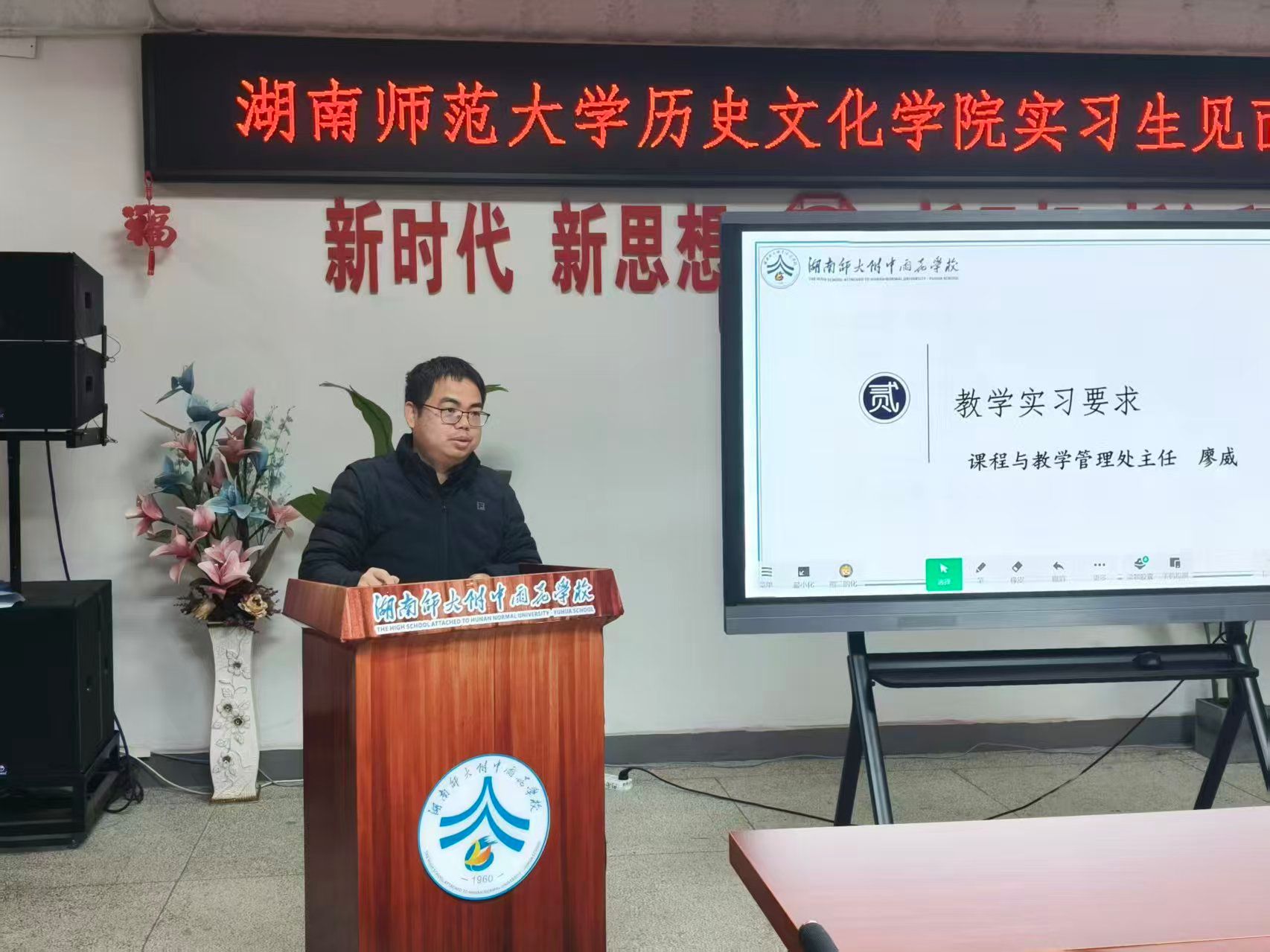 课程与教学管理处主任廖威老师与实习生进行了互动交流。在听取了实习生对教学工作的理解后,廖老师系统阐述了“备、教、批、复、考”五个教学关键环节,并勉励大家在实习中做到“三备”:备课标、备教材、备学情。实习生们纷纷表示,将珍惜每一次听课、备课、上课的机会,在指导老师的帮助下,尽快将大学所学转化为实际教学能力。
