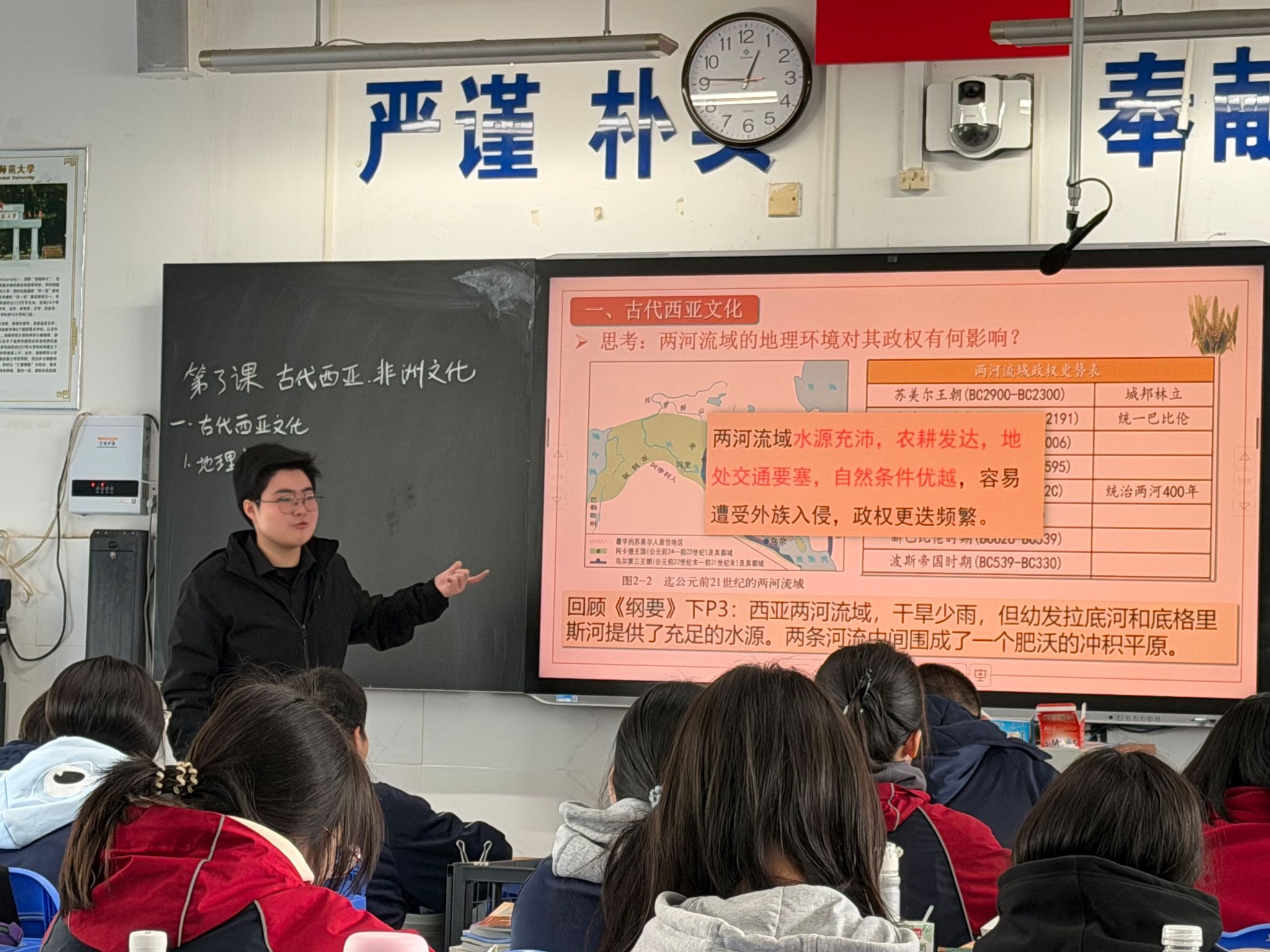 (通讯员:李思怡涂礼勇)2026年3月27日,WilliamHill(威廉希尔)官网赴望城一中实习队开展首次正式进班授课活动,实习教师何紫昕执教高中历史选择性必修三第3课《古代西亚、非洲文化》,课堂成效显著,获师生一致好评。