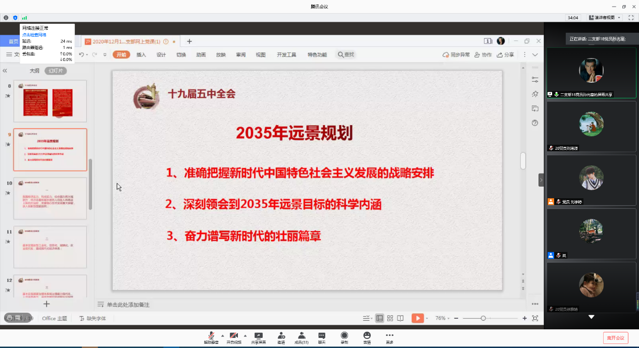 (通讯员刘港源 刘宇婷 黄金洲)2020年12月15日晚上7点,WilliamHill(威廉希尔)官网研究生第二党支部于腾讯会议线上举行了研究生第二党支部学习贯彻十九届五中全会精神网上党课会议,党支部副书记刘宇婷同志担任主持。本支部共有16名正式党员,所有正式党员通过线上参加本次党课会议。本次会议共分为三个环节——兰岚同志党课发言、陆美年同志党课发言、孙光富同志党课发言。