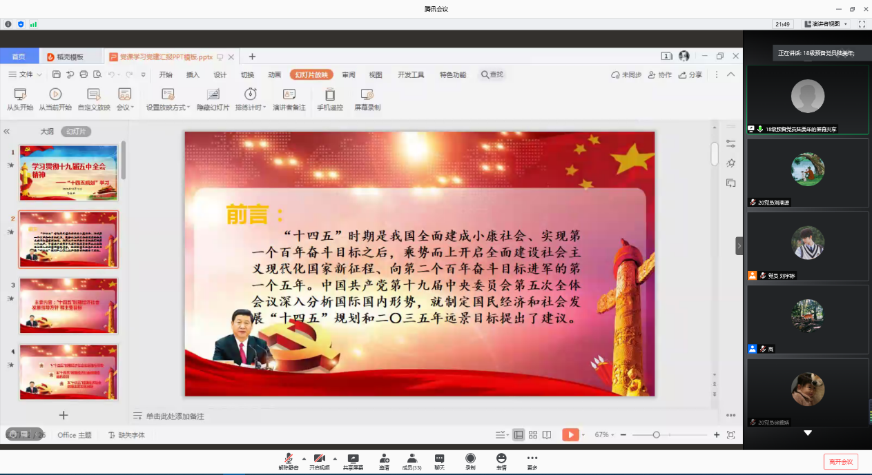 最后,在支部副书记刘宇婷同志确认了相关会议事宜后,支部书记兰岚同志对于本次党课会议的内容表示了肯定,研究生第二党支部学习贯彻十九届五中全会精神网上党课圆满结束了。