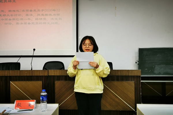 预备党员朱灵、杨涛依次发言,宣读转正申请,并结合个人生活、工作、思想和学习状况进行汇报,随后,其预备期间的考察联系人介绍其在预备期间的表现,表明本人是否同意其按期转为正式党员的意见。经过表决,以上两位同学均成功转正。