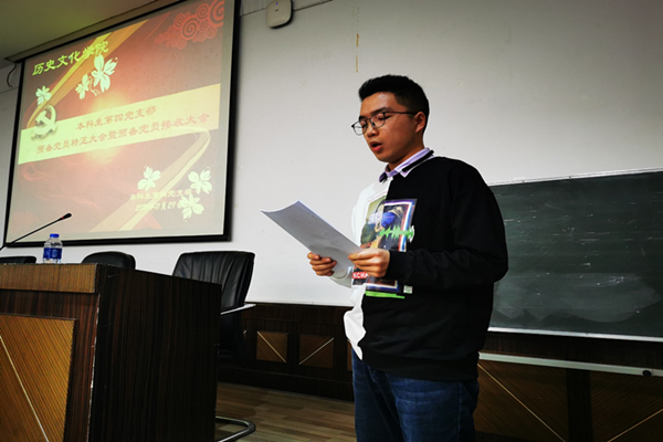 最后,历文院党委书记孔春辉与本科生第四党支部书记段炼依次发言,表达了对此次成功转正和转为预备党员的同志的祝贺和对支部发展的期望。