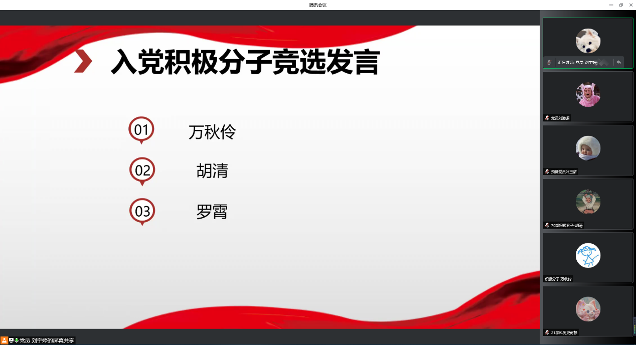 推优线上会议开始,支部书记刘宇婷同志致开场词,介绍了本次会议的相关流程和投票规则。接着进行第一个环节,会议严格按照党组织选举程序进行,积极分子推优评选。按照顺序,3名候选人万秋伶同志、胡清同志、罗霄同志分别从思想上、学习上、工作上等方面进行了个人陈述,表明了自己入党的心路历程、研究生生活和学习经历和参加积极分子推优评选的理由。
