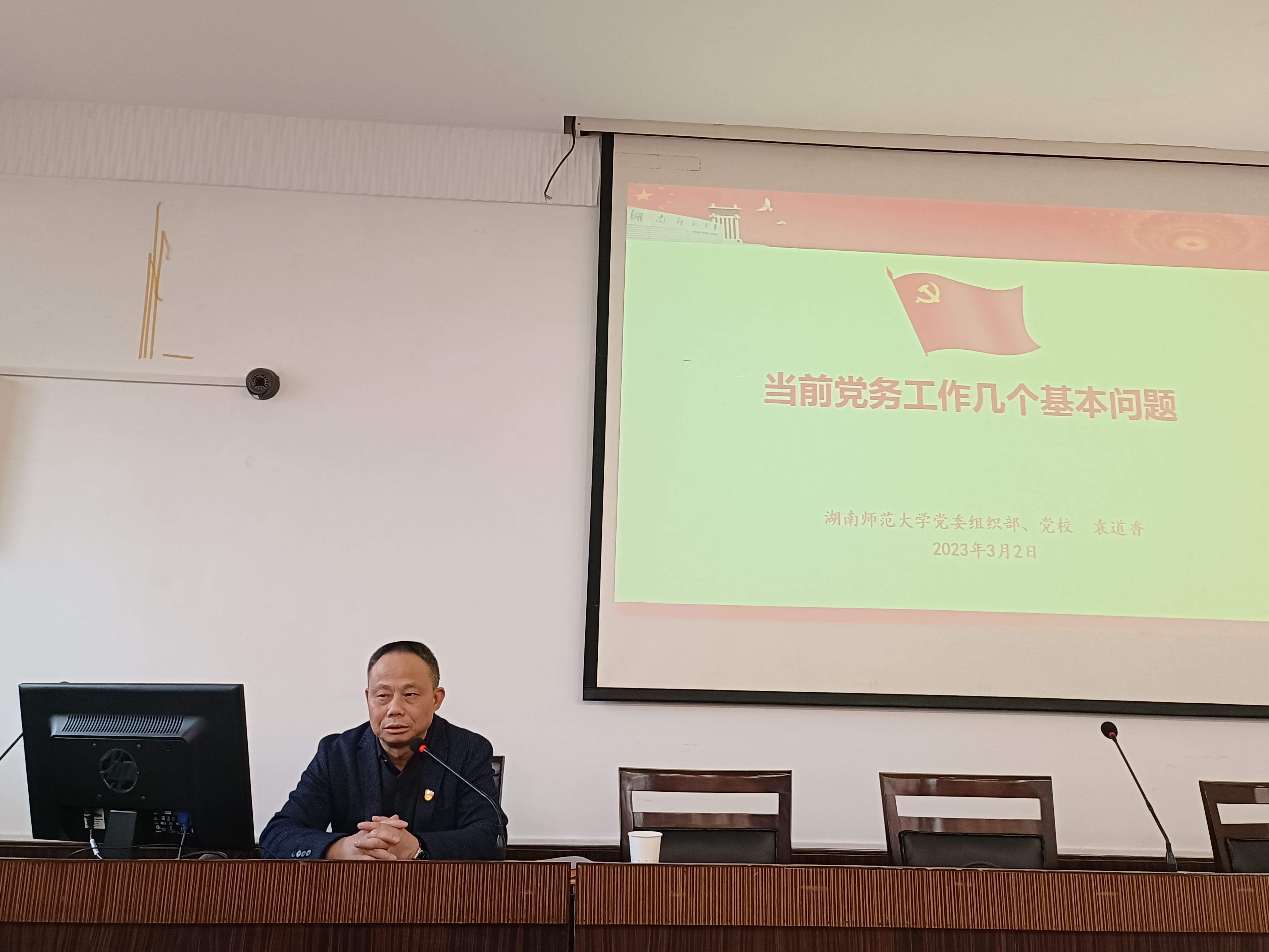 袁道香以“当前党务工作几个基本问题”为主题,阐述了党支部的功能定位,支部书记、支委的职责使命,如何做好基层党务工作等,强调实施四大工程、开展“一月一课一片一实践”活动,推进整建提质,加强基层党支部建设。