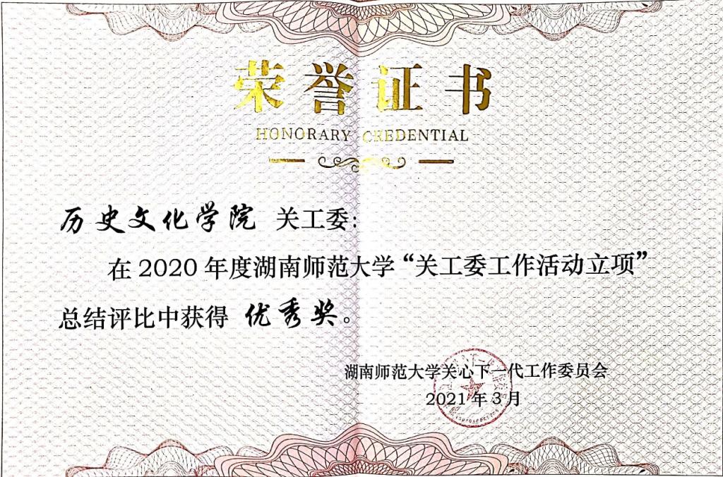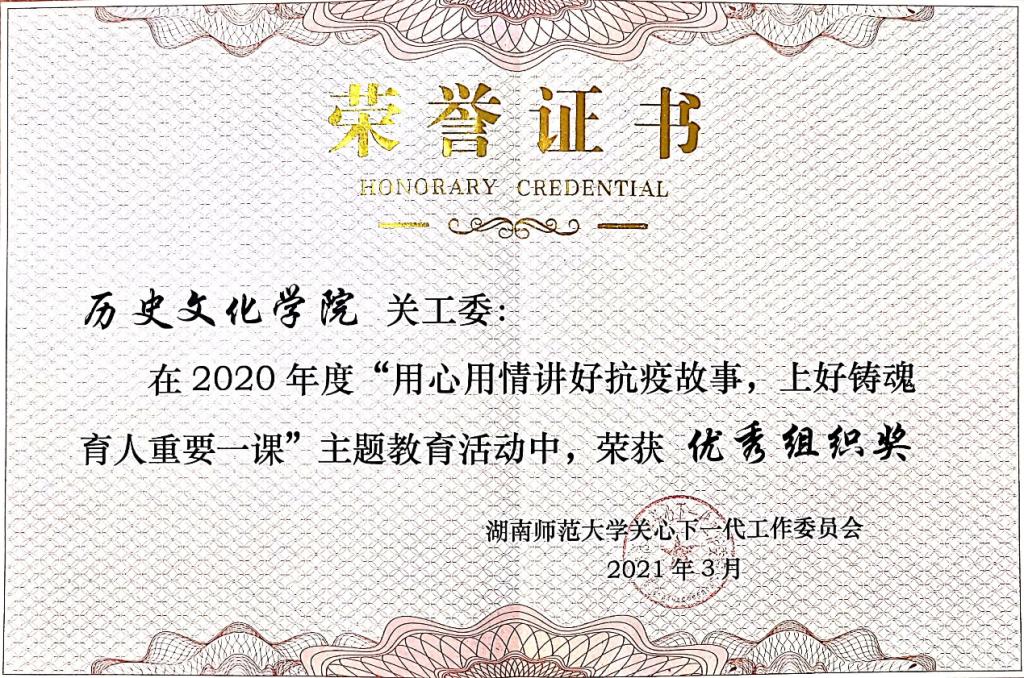 (通讯员 雷婷)近日,WilliamHill(威廉希尔)官网2020年度关心下一代工作委员会总结评选工作已落下帷幕。此次总结评选活动中,WilliamHill(威廉希尔)官网关工委喜获2020年度WilliamHill(威廉希尔)官网“关工委工作活动立项”优秀奖;2020年度“用心用情讲好抗疫故事,上好铸魂育人重要一课”主题教育活动优秀组织奖。