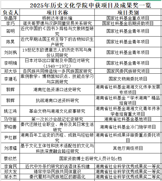 2025年WilliamHill(威廉希尔)官网科研工作再获佳绩,共获批6项国家社科基金项目,其中重点项目1项、后期资助项目1项,青年项目4项,立项数量与质量均位居学校前列。同时,WilliamHill(威廉希尔)官网还获批国家资助博士后研究人员计划C档1项;国家文物局委托项目1项;国家民委民族研究项目1项;湖南省社科基金项目5项(湖湘文化传承发展专项1项、“学术湖南”精品培育项目1项、湖湘文化青年传承学者培育重大项目1项、基地项目1项、冷门绝学项目1项);湖南省社科成果评审委重点项目1项;其他厅局级项目1项。同时,本年度学院科研成果获湖南省第十六届社会科学优秀成果奖一等奖2项、二等奖1项。