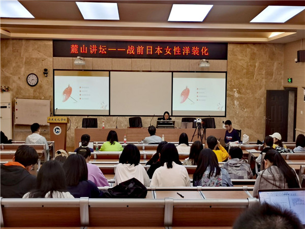 讲坛开始,主持人先对主讲人和受邀嘉宾进行了相关介绍,并宣布活动开始。随后,主讲人就战前日本女性服饰的洋装化进行了探讨,通过视频的形式生动的展示了日本女性服饰的变化过程,分析了其变化背后的历史背景及原因。提问环节中,同学们积极踊跃提问,主讲人对其进行了详细的解答。最后由受邀嘉宾段炼教授和吴雅丽老师对讲述内容进行了点评,对其给予了高度评价的同时做了详细的总结。